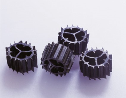 Another biological filter is the moving bed filter. These filters have a high filter capacity with low volume. The moving bed filter consists of a tank with aeration device and is filled with filter beads (many shapes and sizes available). A biofilm of nitrifying bacteria grows on the surface of the beads.
